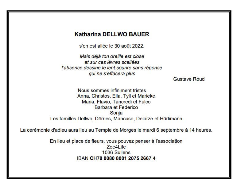 Katharina DELLWO BAUER 03 déc. 1952 - 30 aoû. 2022 Avis mortuaire PFG Télecharger PDF Partager sur: Galerie PreviousNext PreviousNext