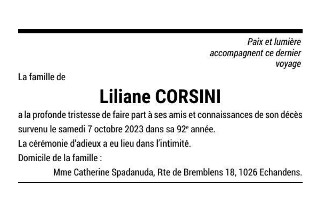 Liliane CORSINI 23 fév. 1932 - 07 oct. 2023 Avis mortuaire PFG Télecharger PDF Partager sur: Galerie PreviousNext PreviousNext