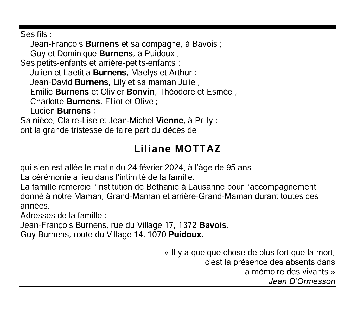Liliane MOTTAZ 01 jan. 1929 - 24 fév. 2024 Avis mortuaire PFG Télecharger PDF Partager sur: Galerie PreviousNext PreviousNext