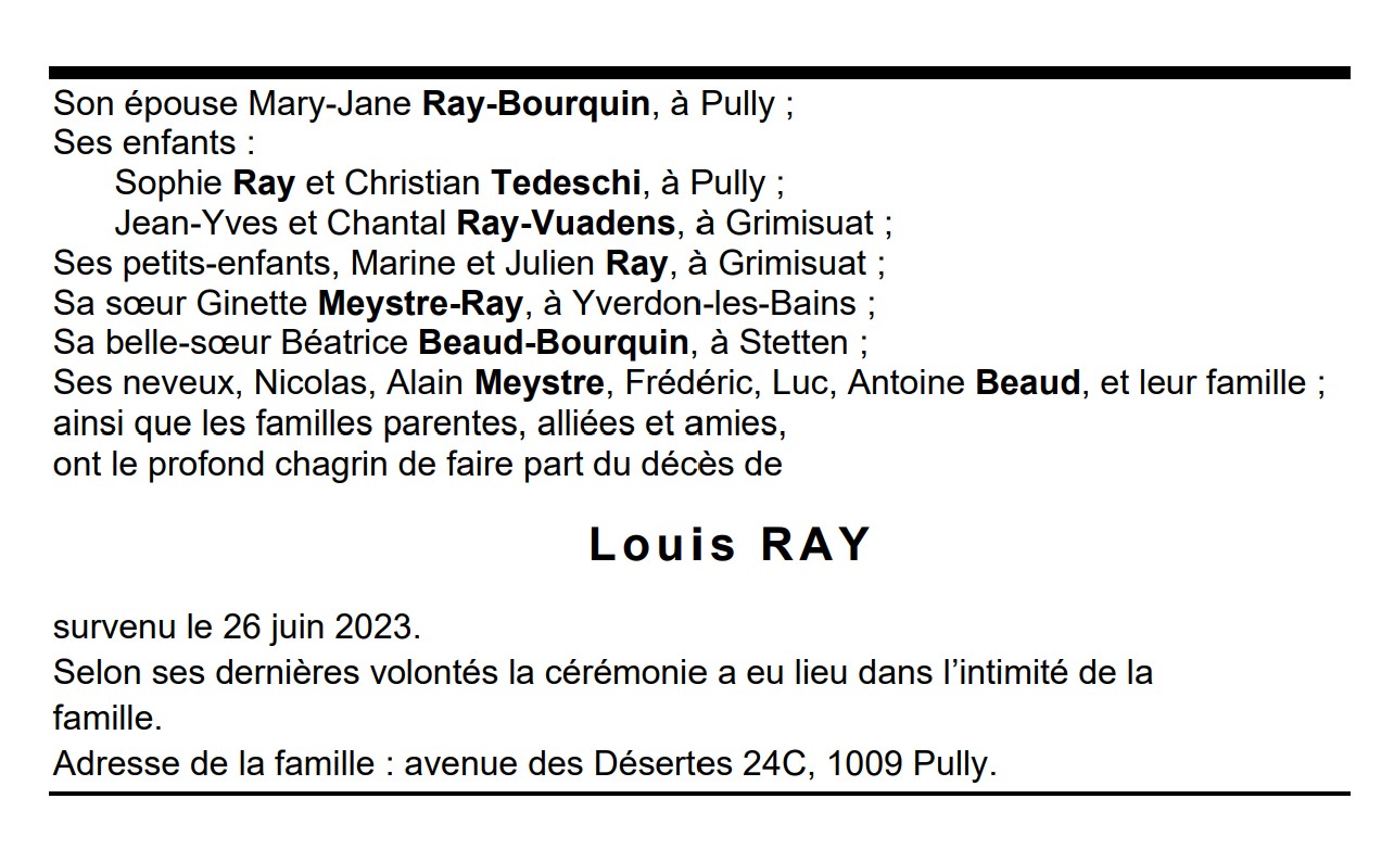 Louis RAY 30 mar. 1938 - 26 juin. 2023 Avis mortuaire PFG Télecharger PDF Partager sur: Galerie PreviousNext PreviousNext