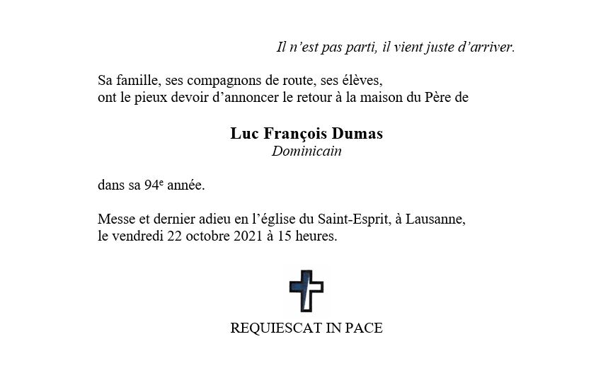 Luc François Dumas 16 nov. 1927 - 19 oct. 2021 Avis mortuaire PFG Télecharger PDF Partager sur: Galerie PreviousNext PreviousNext