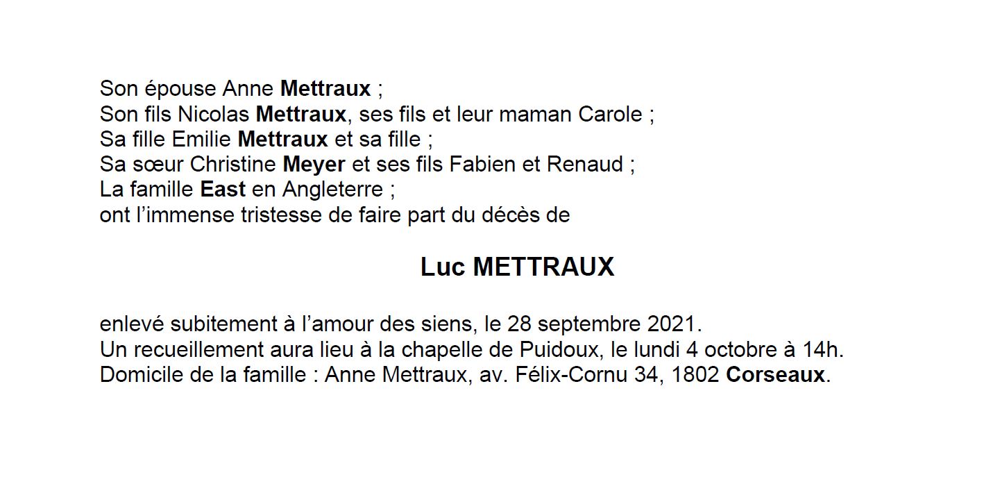 Luc METTRAUX 26 sep. 1947 - 28 sep. 2021 Avis mortuaire PFG Télecharger PDF Partager sur: Galerie PreviousNext PreviousNext