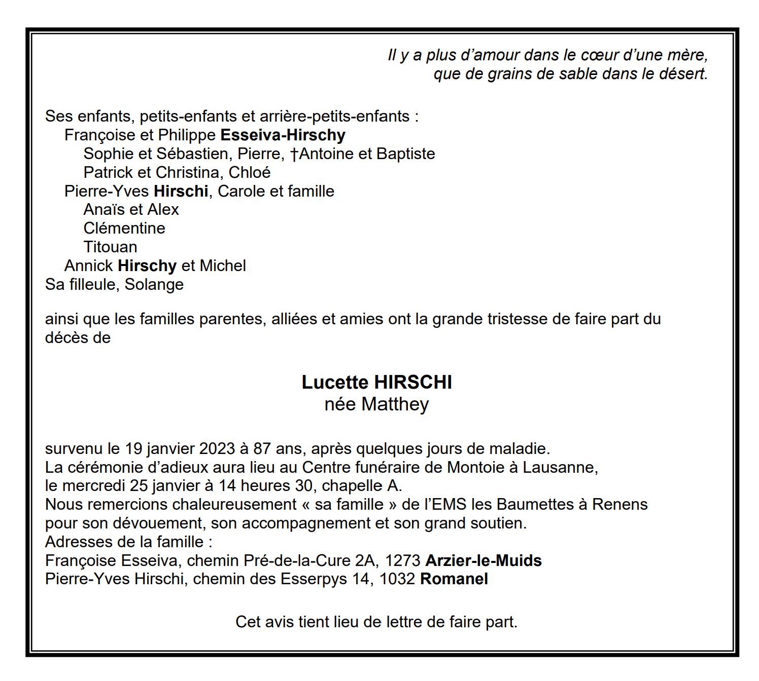 Lucette HIRSCHI 21 fév. 1935 - 19 jan. 2023 Avis mortuaire PFG Télecharger PDF Partager sur: Galerie PreviousNext PreviousNext