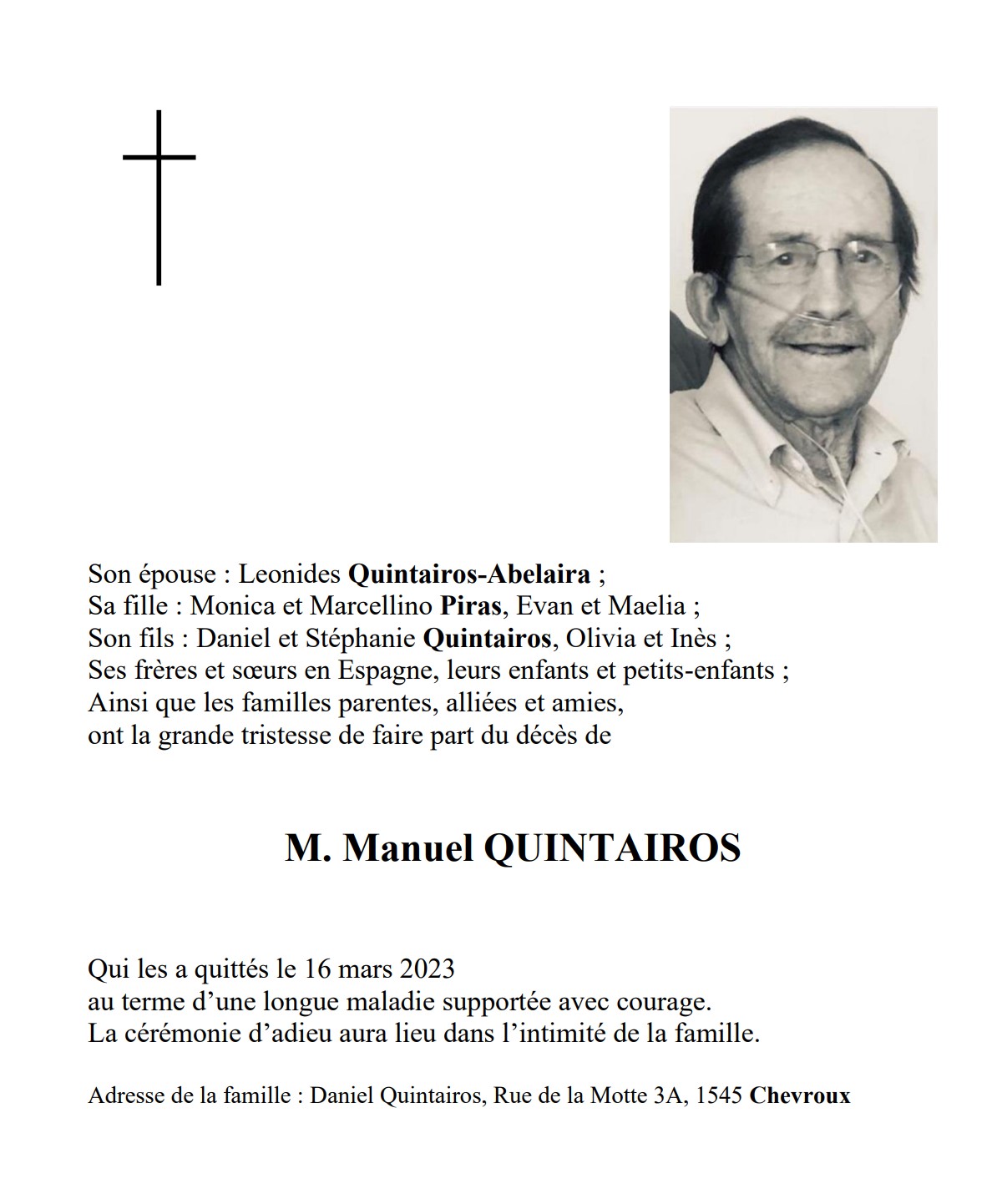 M. Manuel QUINTAIROS 11 jan. 1942 - 16 mar. 2023 Avis mortuaire PFG Télecharger PDF Partager sur: Galerie PreviousNext PreviousNext