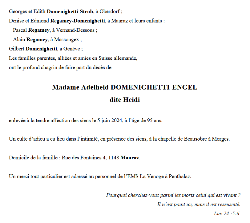 Madame Adelheid DOMENIGHETTI-ENGEL 19 avr. 1929 - 05 juin. 2024 Avis mortuaire PFG Télecharger PDF Partager sur: Galerie PreviousNext PreviousNext