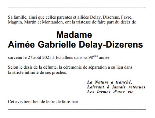 Madame Aimée Gabrielle DELAY-DIZERENS 21 mar. 1924 - 27 aoû. 2021 Avis mortuaire PFG Télecharger PDF Partager sur: Galerie PreviousNext PreviousNext