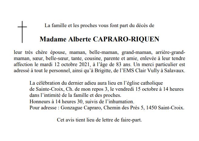 Madame Alberte CAPRARO-RIQUEN 10 fév. 1938 - 12 oct. 2021 Avis mortuaire PFG Télecharger PDF Partager sur: Galerie
