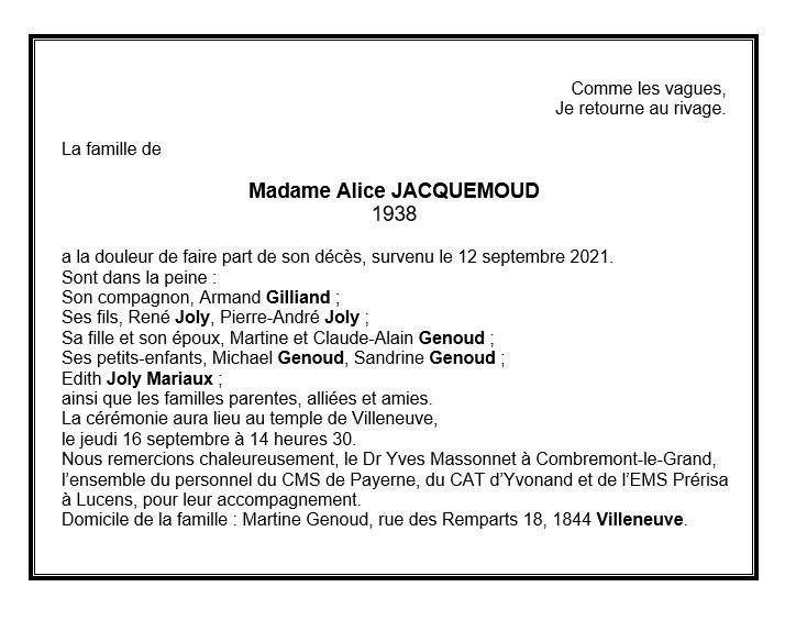 Madame Alice JACQUEMOUD 02 oct. 1938 - 12 sep. 2021 Avis mortuaire PFG Télecharger PDF Partager sur: Galerie PreviousNext PreviousNext