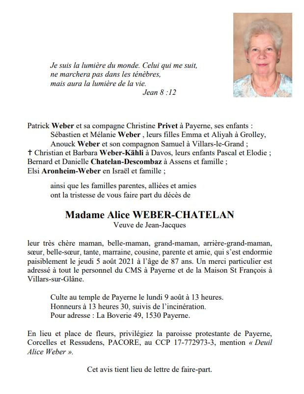 Madame Alice WEBER - CHATELAN 27 juin. 1934 - 05 aoû. 2021 Avis mortuaire PFG Télecharger PDF Partager sur: Galerie PreviousNext PreviousNext
