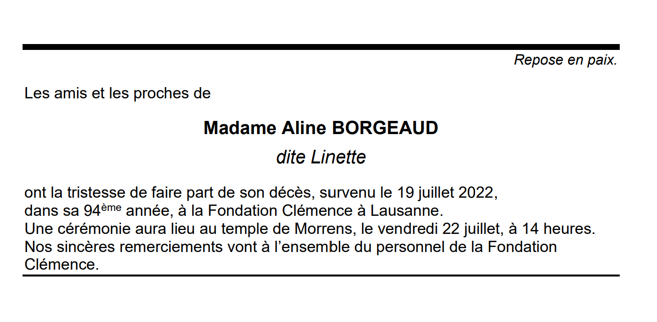 Madame Aline BORGEAUD 01 oct. 1928 - 19 juil. 2022 Avis mortuaire PFG Télecharger PDF Partager sur: Galerie PreviousNext PreviousNext