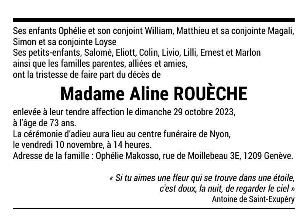 Madame Aline ROUÈCHE 31 mar. 1950 - 29 oct. 2023 Avis mortuaire PFG Télecharger PDF Partager sur: Galerie PreviousNext PreviousNext