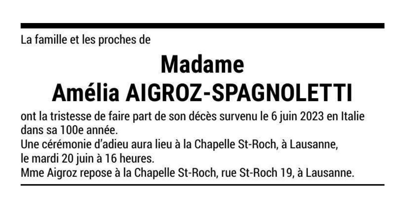 Madame Amélia AIGROZ-SPAGNOLETTI 25 sep. 1923 - 06 juin. 2023 Avis mortuaire PFG Télecharger PDF Partager sur: Galerie PreviousNext PreviousNext