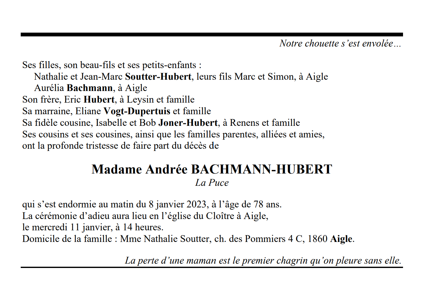 Madame Andrée BACHMANN-HUBERT 08 oct. 1944 - 08 jan. 2023 Avis mortuaire PFG Télecharger PDF Partager sur: Galerie PreviousNext PreviousNext