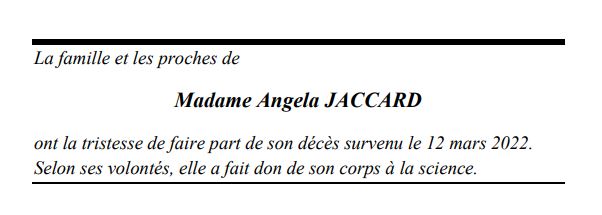 Madame Angela JACCARD 15 mai. 1937 - 12 mar. 2022 Avis mortuaire PFG Télecharger PDF Partager sur: Galerie PreviousNext PreviousNext