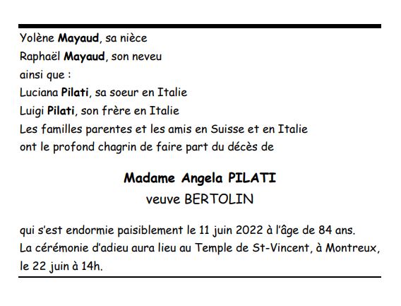 Madame Angela PILATI 12 nov. 1937 - 11 juin. 2022 Avis mortuaire PFG Télecharger PDF Partager sur: Galerie PreviousNext PreviousNext