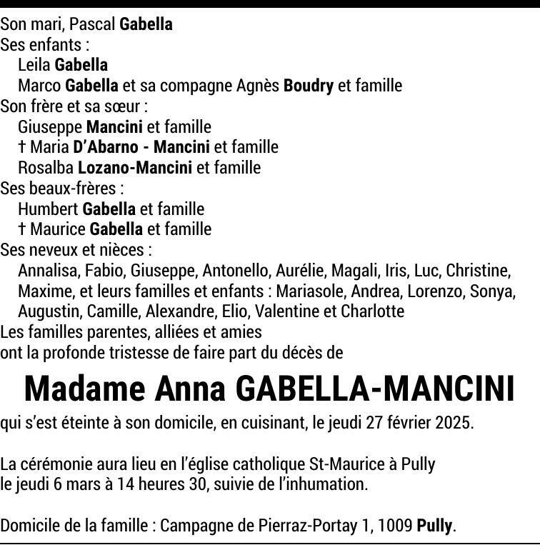 Madame Anna GABELLA-MANCINI 20 juil. 1943 - 27 fév. 2025 Avis mortuaire PFG Partager sur: Galerie PreviousNext PreviousNext