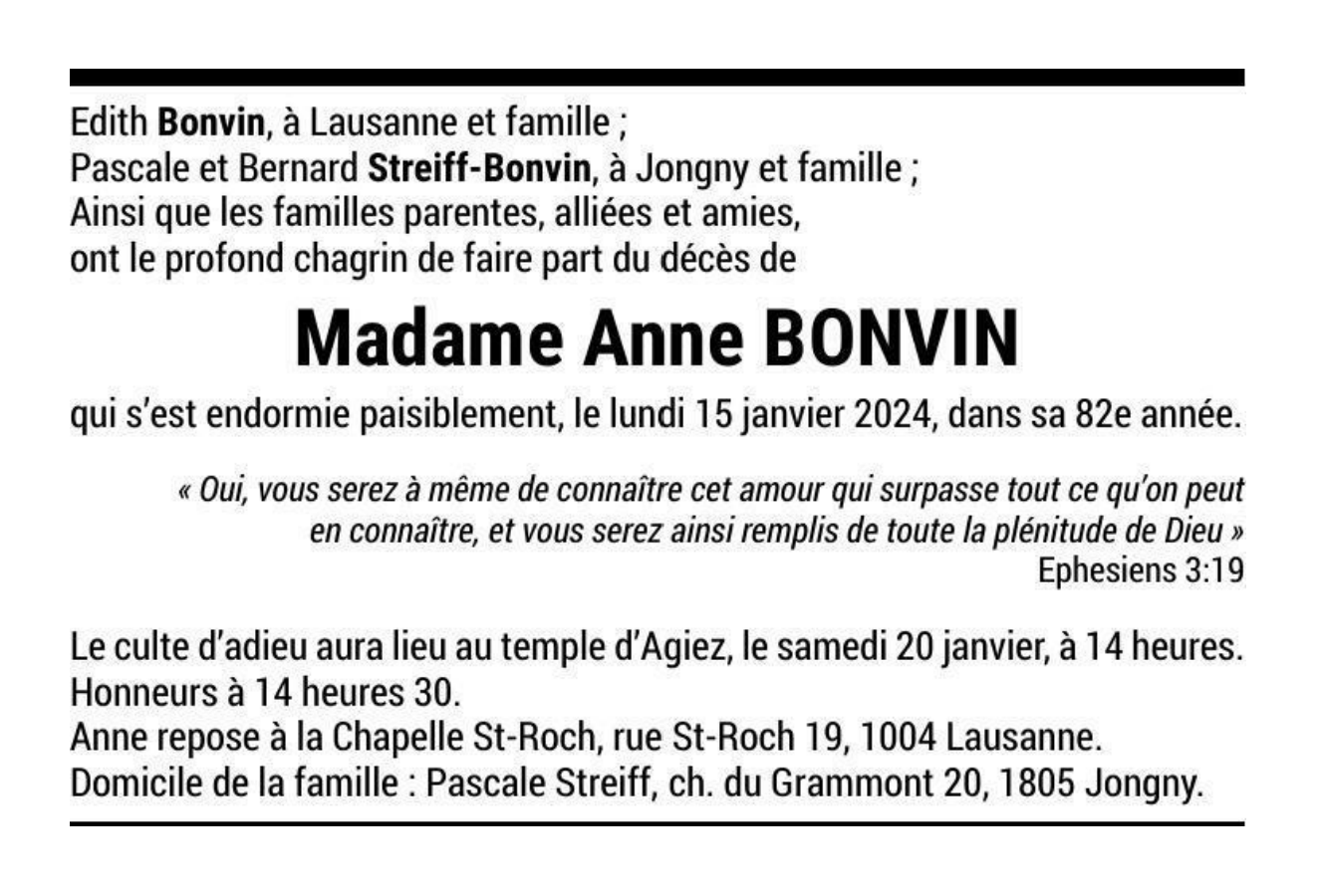 Madame Anne BONVIN 24 juil. 1942 - 15 jan. 2024 Avis mortuaire PFG Télecharger PDF Partager sur: Galerie PreviousNext PreviousNext