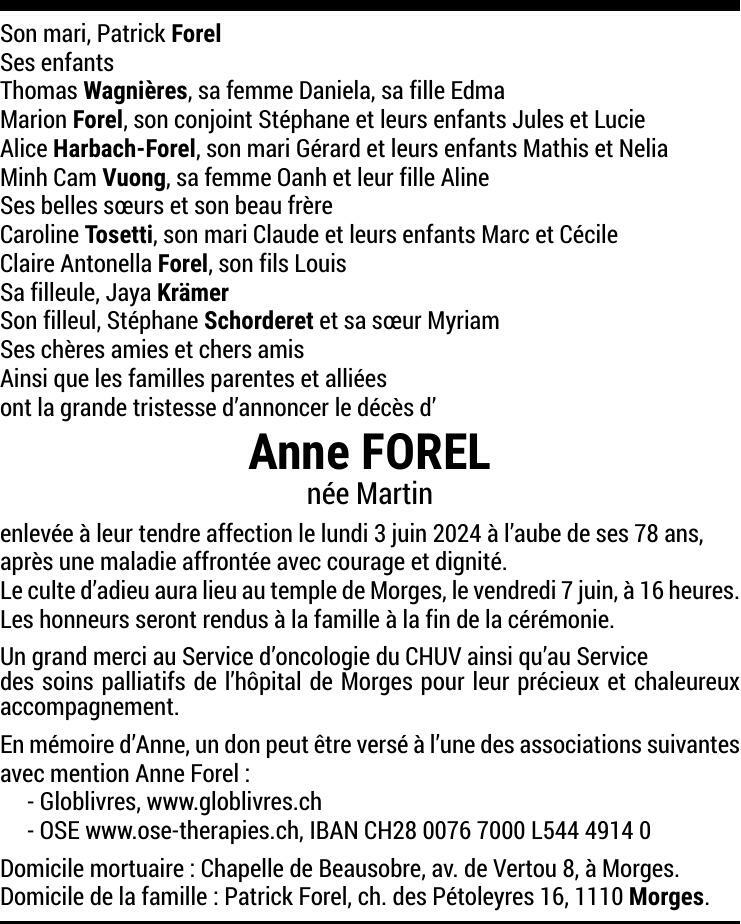 Madame Anne FOREL 05 mai. 1946 - 03 juin. 2024 Avis mortuaire PFG Télecharger PDF Partager sur: Galerie PreviousNext PreviousNext