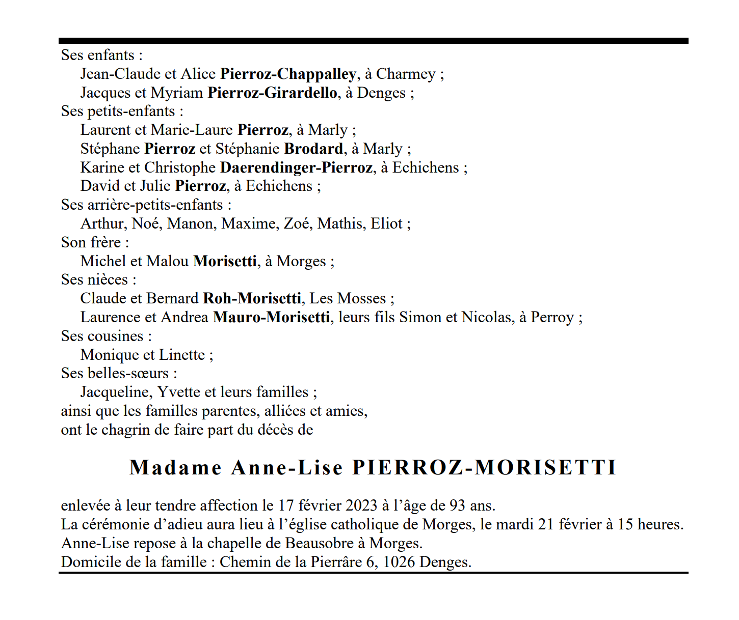 Madame Anne-Lise PIERROZ-MORISETTI 25 jan. 1930 - 17 fév. 2023 Avis mortuaire PFG Télecharger PDF Partager sur: Galerie PreviousNext PreviousNext