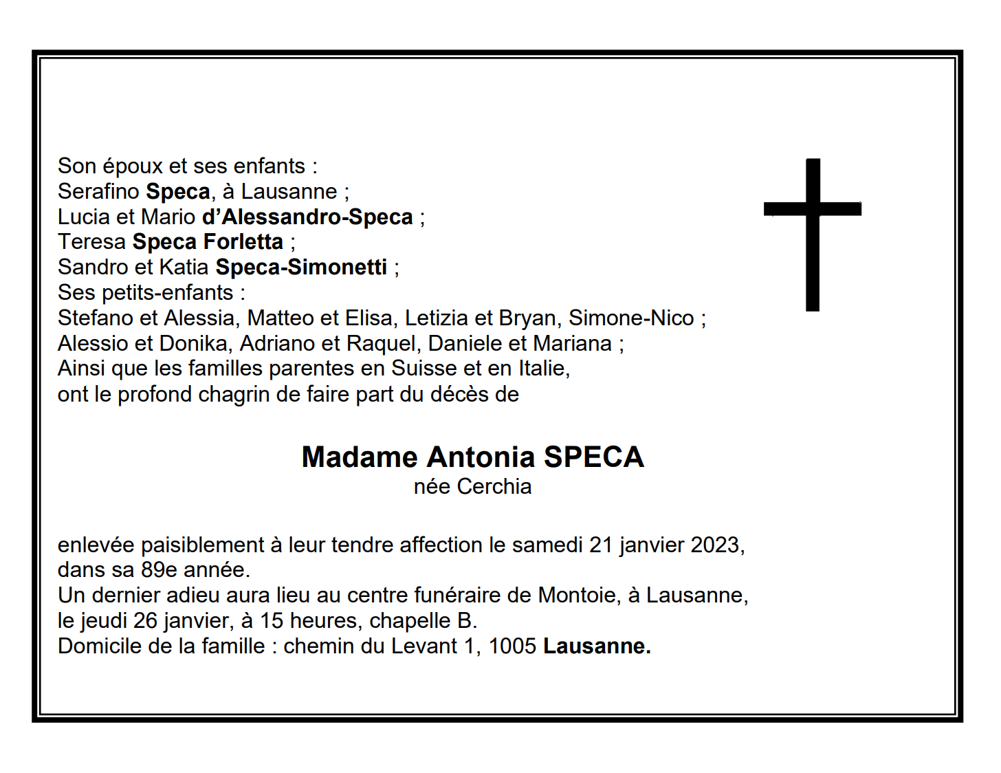 Madame Antonia SPECA 21 avr. 1934 - 21 jan. 2023 Avis mortuaire PFG Télecharger PDF Partager sur: Galerie PreviousNext PreviousNext