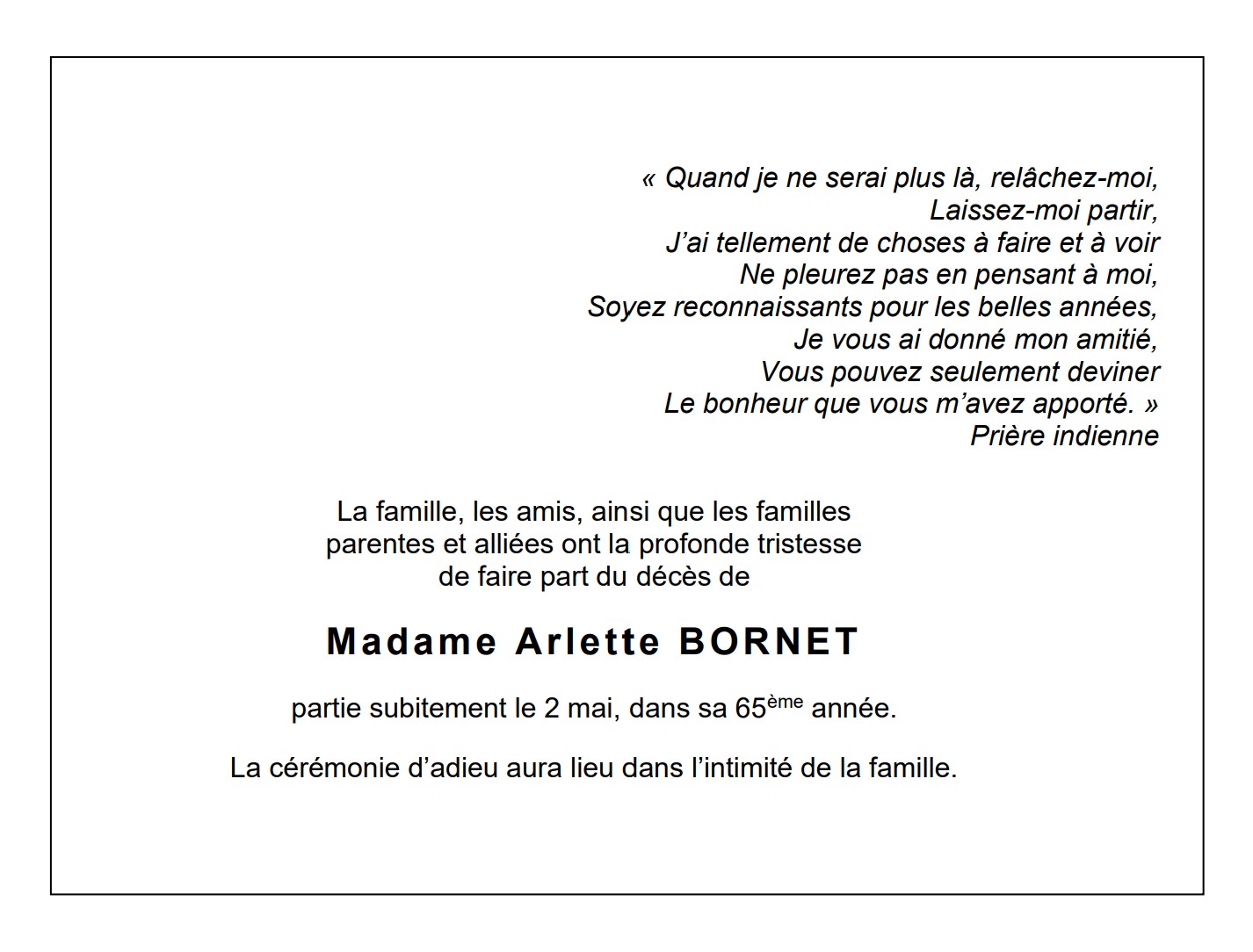 Madame Arlette BORNET 11 juil. 1958 - 02 mai. 2023 Avis mortuaire PFG Télecharger PDF Partager sur: Galerie