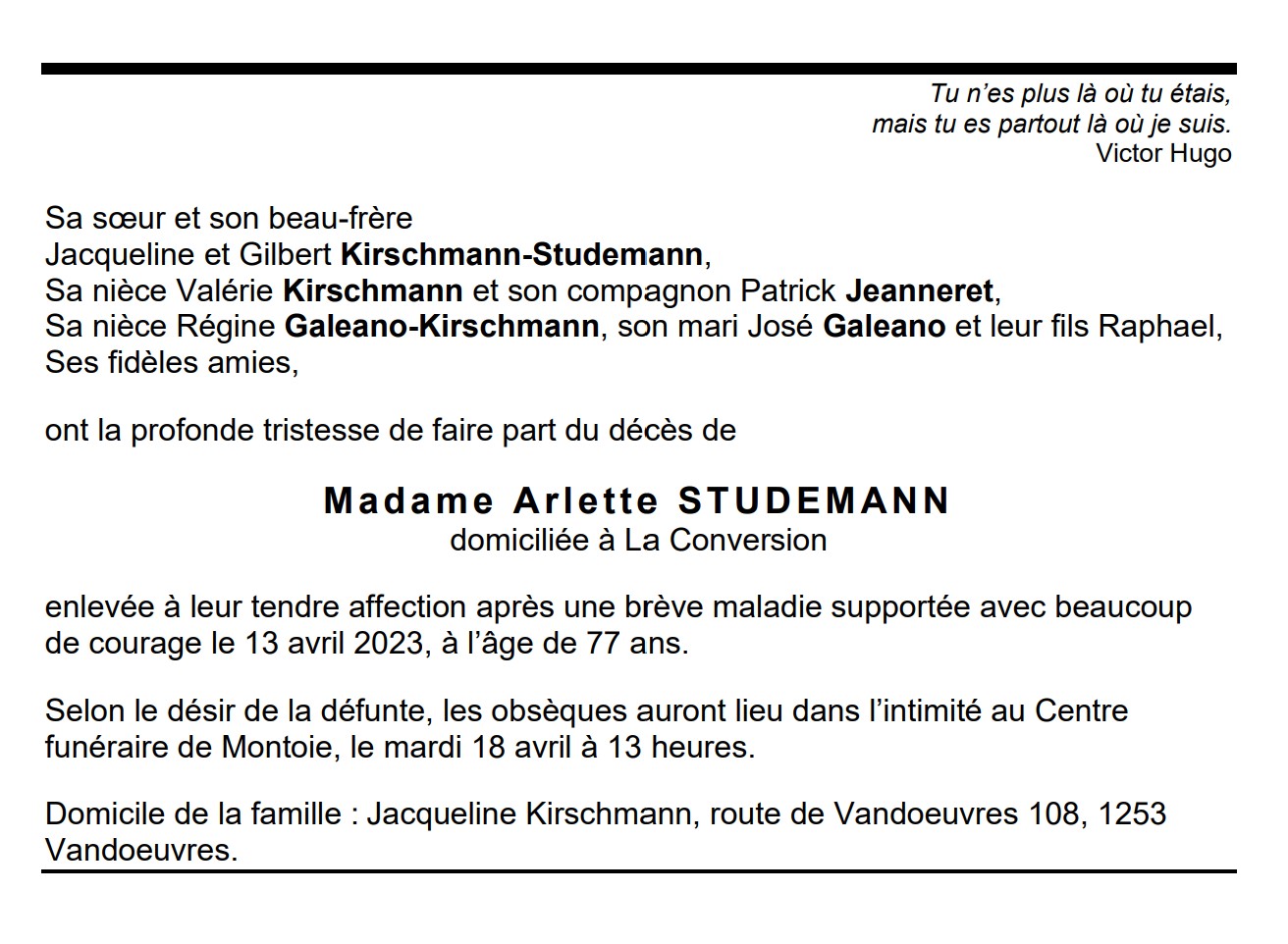 Madame Arlette STUDEMANN 04 fév. 1946 - 13 avr. 2023 Avis mortuaire PFG Télecharger PDF Partager sur: Galerie PreviousNext PreviousNext