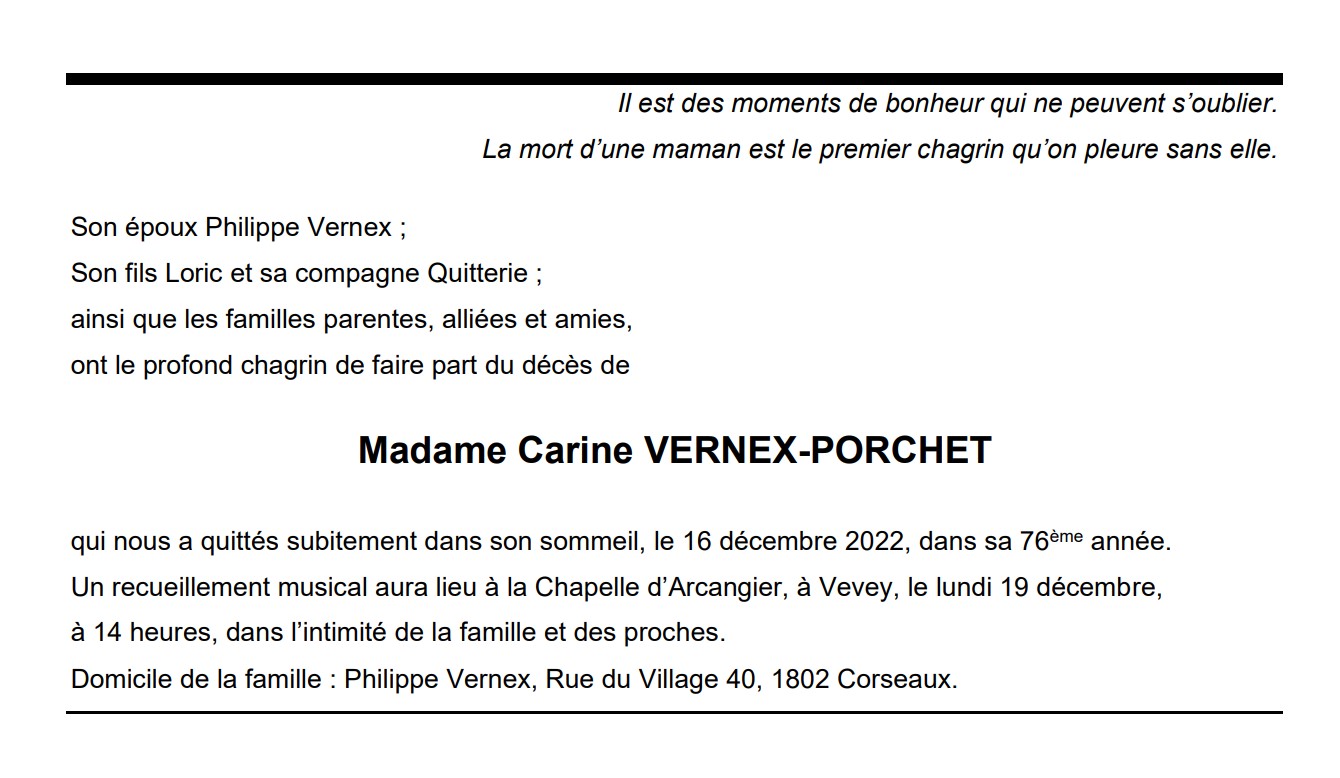 Madame Carine VERNEX-PORCHET 28 mar. 1947 - 16 déc. 2022 Avis mortuaire PFG Télecharger PDF Partager sur: Galerie PreviousNext PreviousNext