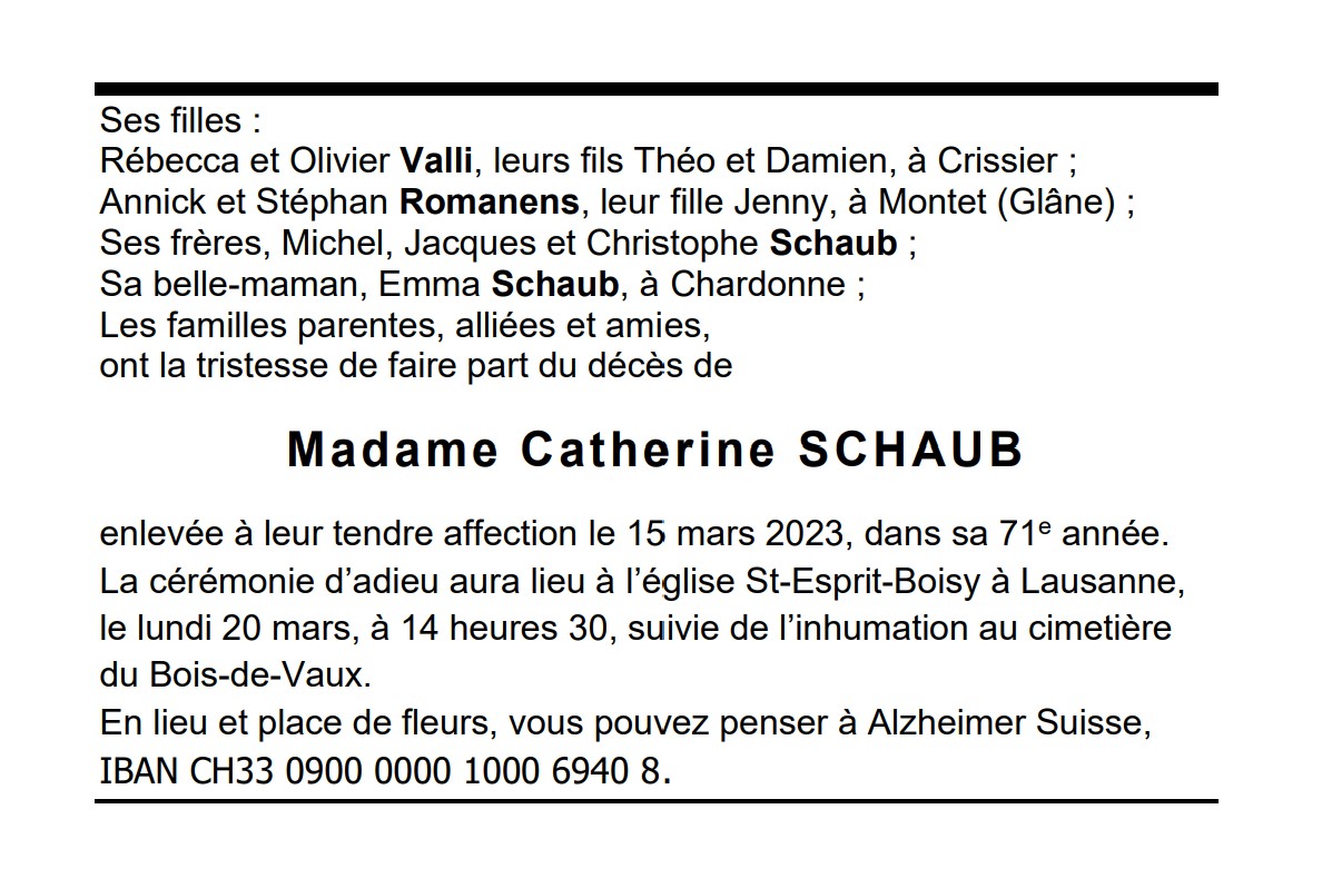 Madame Catherine SCHAUB 23 juin. 1952 - 15 mar. 2023 Avis mortuaire PFG Télecharger PDF Partager sur: Galerie PreviousNext PreviousNext