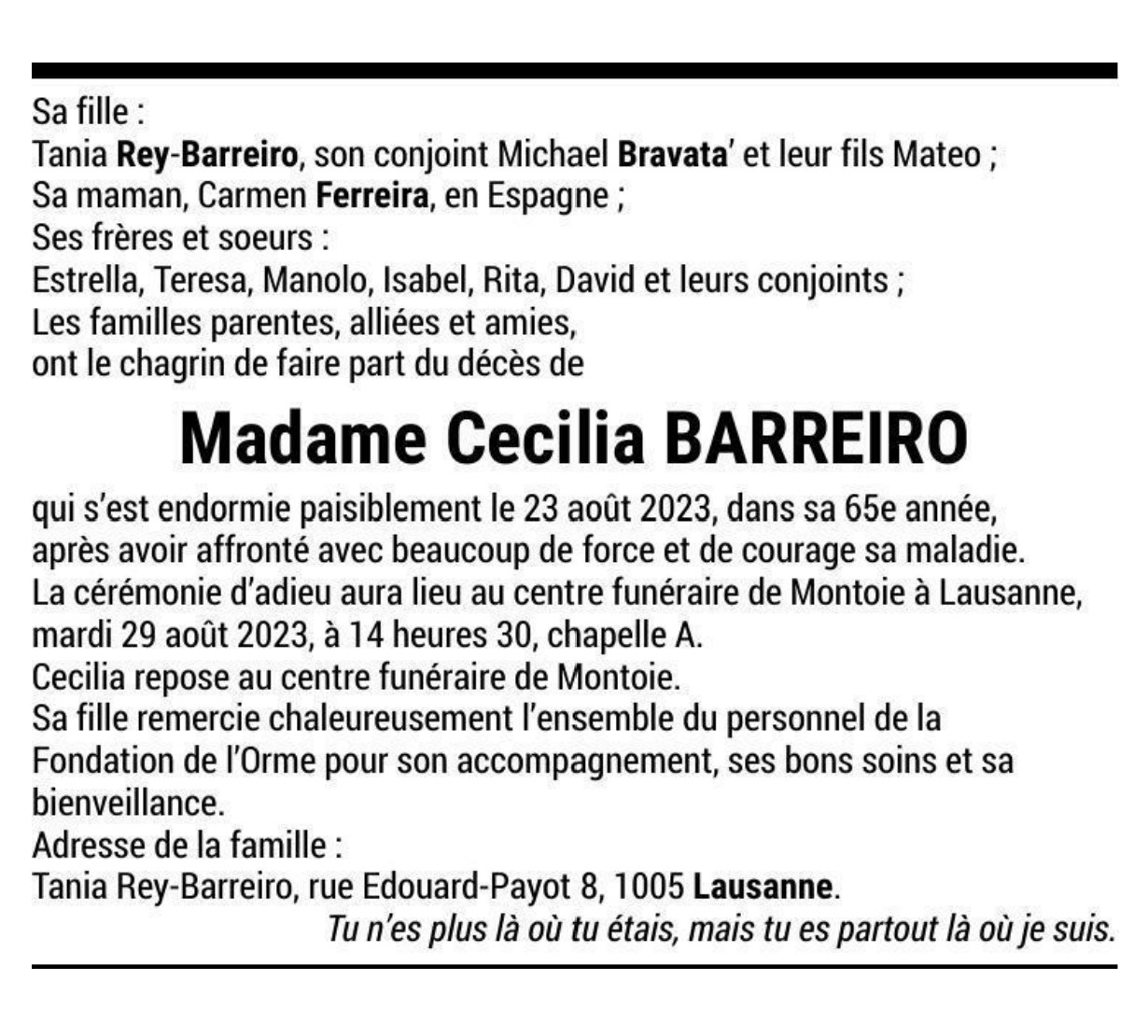 Madame Cecilia BARREIRO 26 oct. 1958 - 23 aoû. 2023 Avis mortuaire PFG Télecharger PDF Partager sur: Galerie PreviousNext PreviousNext