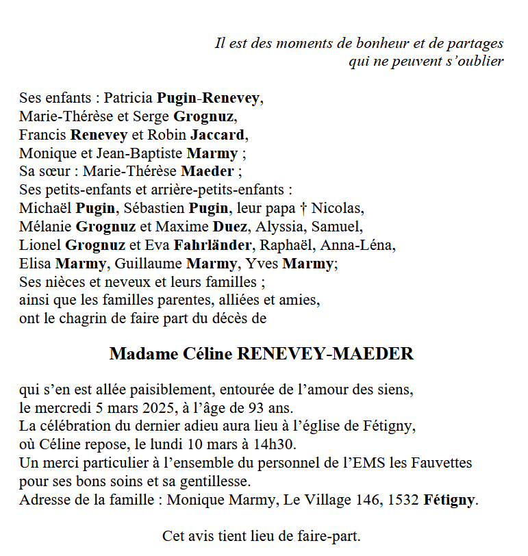 Madame Céline RENEVEY-MAEDER 02 jan. 1932 - 05 mar. 2025 Avis mortuaire PFG Télecharger PDF Partager sur: Galerie
