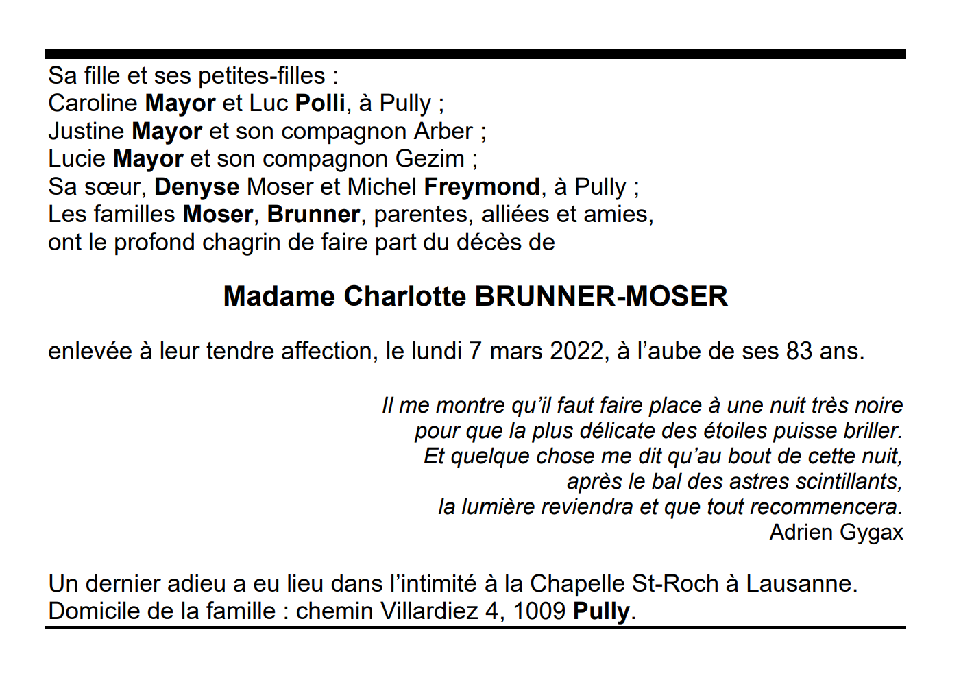 Madame Charlotte BRUNNER-MOSER 23 avr. 1939 - 07 mar. 2022 Avis mortuaire PFG Télecharger PDF Partager sur: Galerie PreviousNext PreviousNext