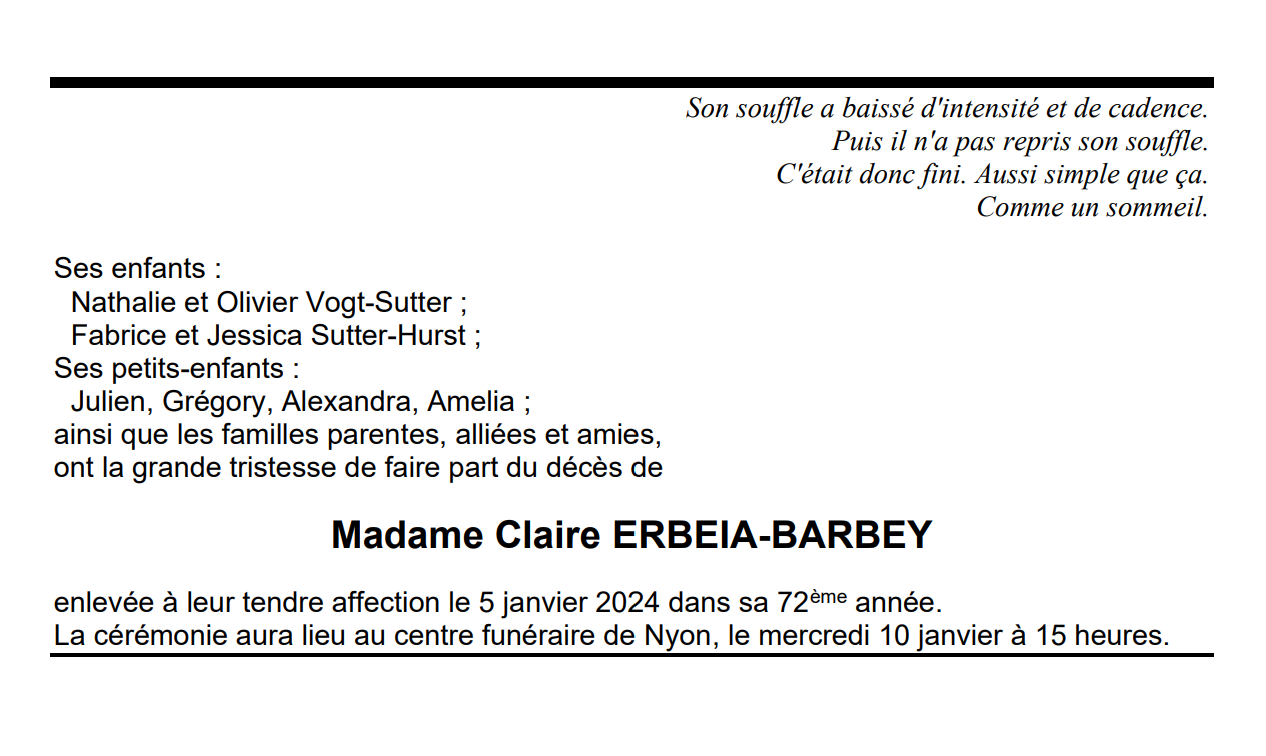 Madame Claire ERBEIA-BARBEY 01 juil. 1952 - 05 jan. 2024 Avis mortuaire PFG Télecharger PDF Partager sur: Galerie PreviousNext PreviousNext