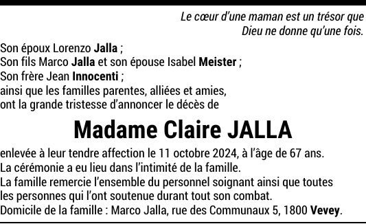 Madame Claire JALLA 19 jan. 1957 - 11 oct. 2024 Avis mortuaire PFG Partager sur: Galerie PreviousNext PreviousNext