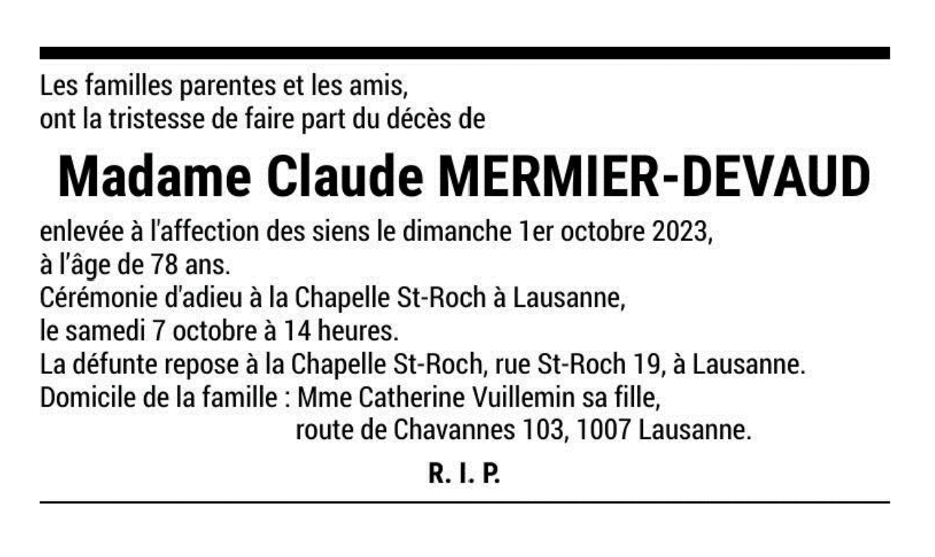 Madame Claude MERMIER-DEVAUD 21 mai. 1945 - 01 oct. 2023 Avis mortuaire PFG Télecharger PDF Partager sur: Galerie PreviousNext PreviousNext