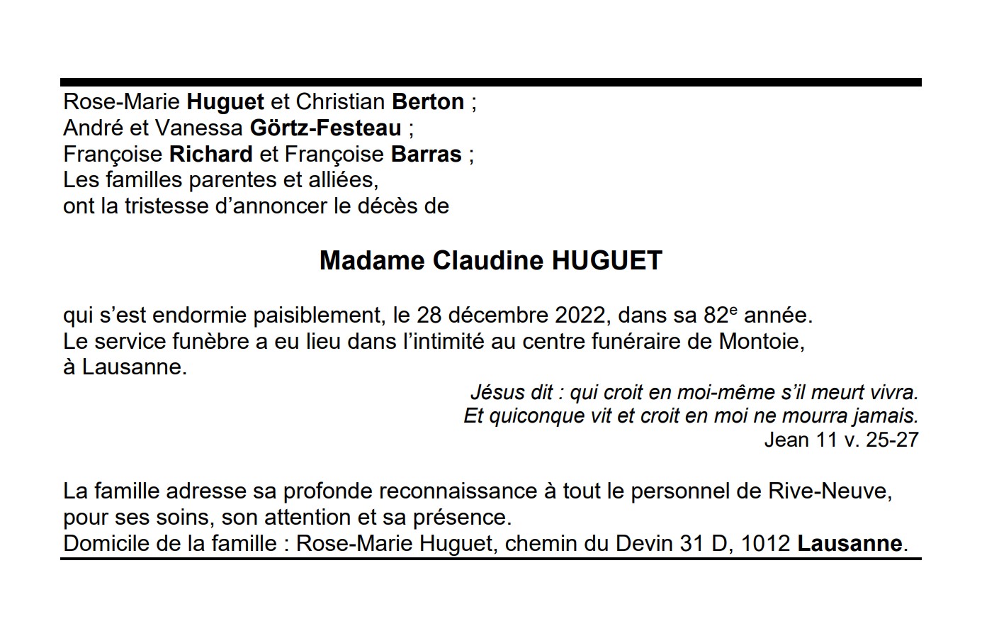 Madame Claudine HUGUET 19 oct. 1941 - 28 déc. 2022 Avis mortuaire PFG Télecharger PDF Partager sur: Galerie PreviousNext PreviousNext