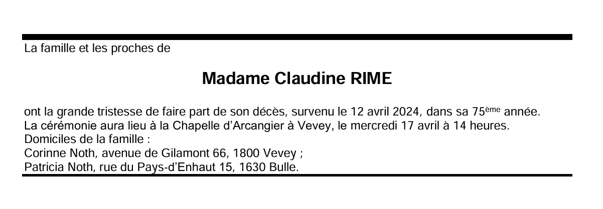 Madame Claudine RIME 19 avr. 1949 - 12 avr. 2024 Avis mortuaire PFG Télecharger PDF Partager sur: Galerie PreviousNext PreviousNext