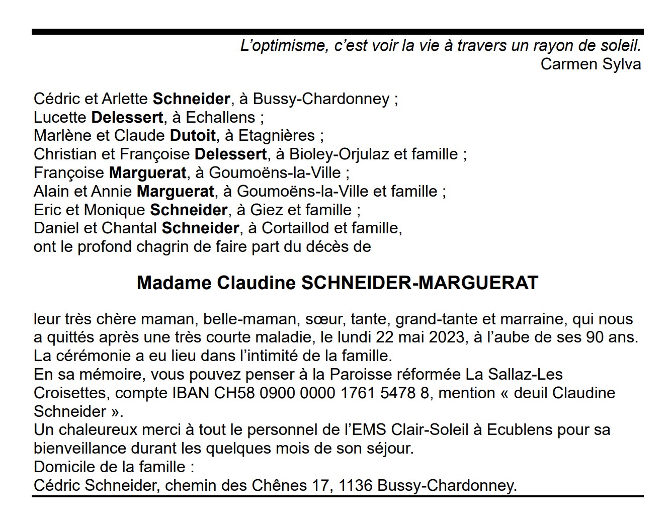 Madame Claudine SCHNEIDER-MARGUERAT 26 mai. 1933 - 22 mai. 2023 Avis mortuaire PFG Télecharger PDF Partager sur: Galerie PreviousNext PreviousNext
