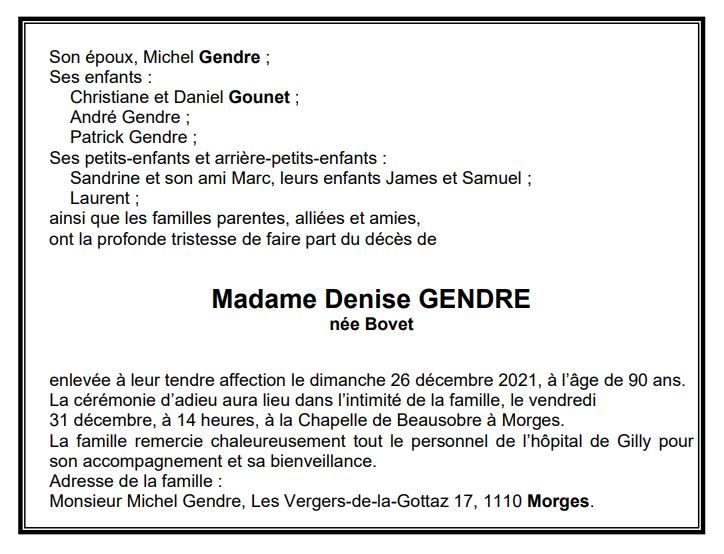 Madame Denise GENDRE 21 déc. 1931 - 26 déc. 2021 Avis mortuaire PFG Télecharger PDF Partager sur: Galerie PreviousNext PreviousNext