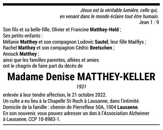 Madame Denise MATTHEY-KELLER 04 juin. 1931 - 21 oct. 2022 Avis mortuaire PFG Télecharger PDF Partager sur: Galerie PreviousNext PreviousNext