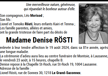 Madame Denise RÖSTI 03 fév. 1944 - 19 aoû. 2024 Avis mortuaire PFG Télecharger PDF Partager sur: Galerie PreviousNext PreviousNext