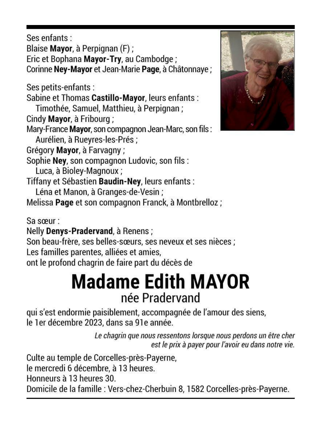 Madame Edith MAYOR née Pradervand 28 mar. 1933 - 01 déc. 2023 Avis mortuaire PFG Télecharger PDF Partager sur: Galerie PreviousNext PreviousNext