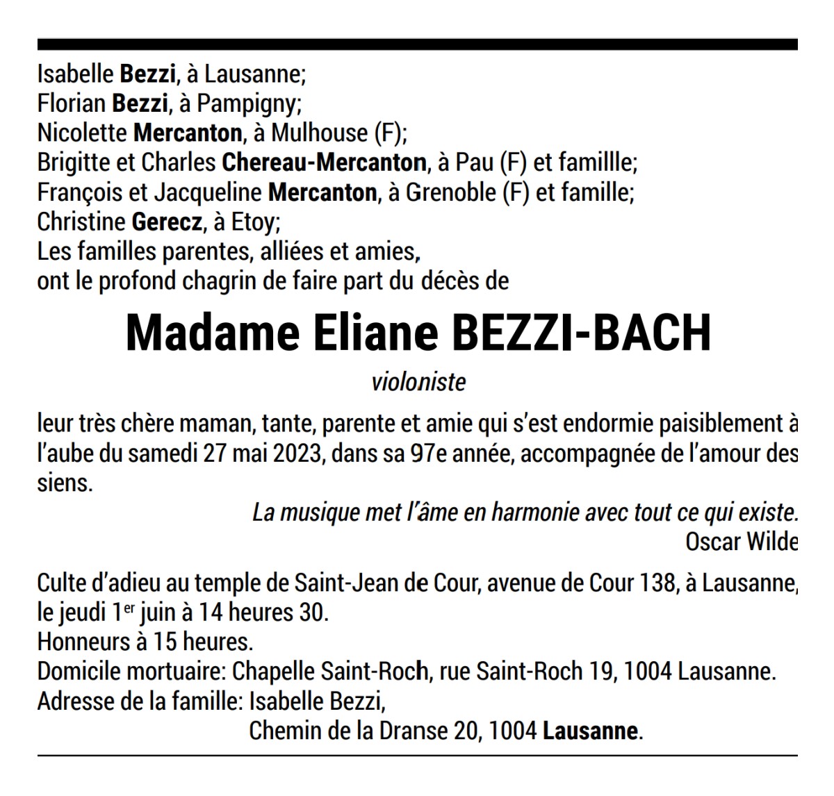 Madame Eliane BEZZI-BACH 20 aoû. 1926 - 27 mai. 2023 Avis mortuaire PFG Télecharger PDF Partager sur: Galerie PreviousNext PreviousNext