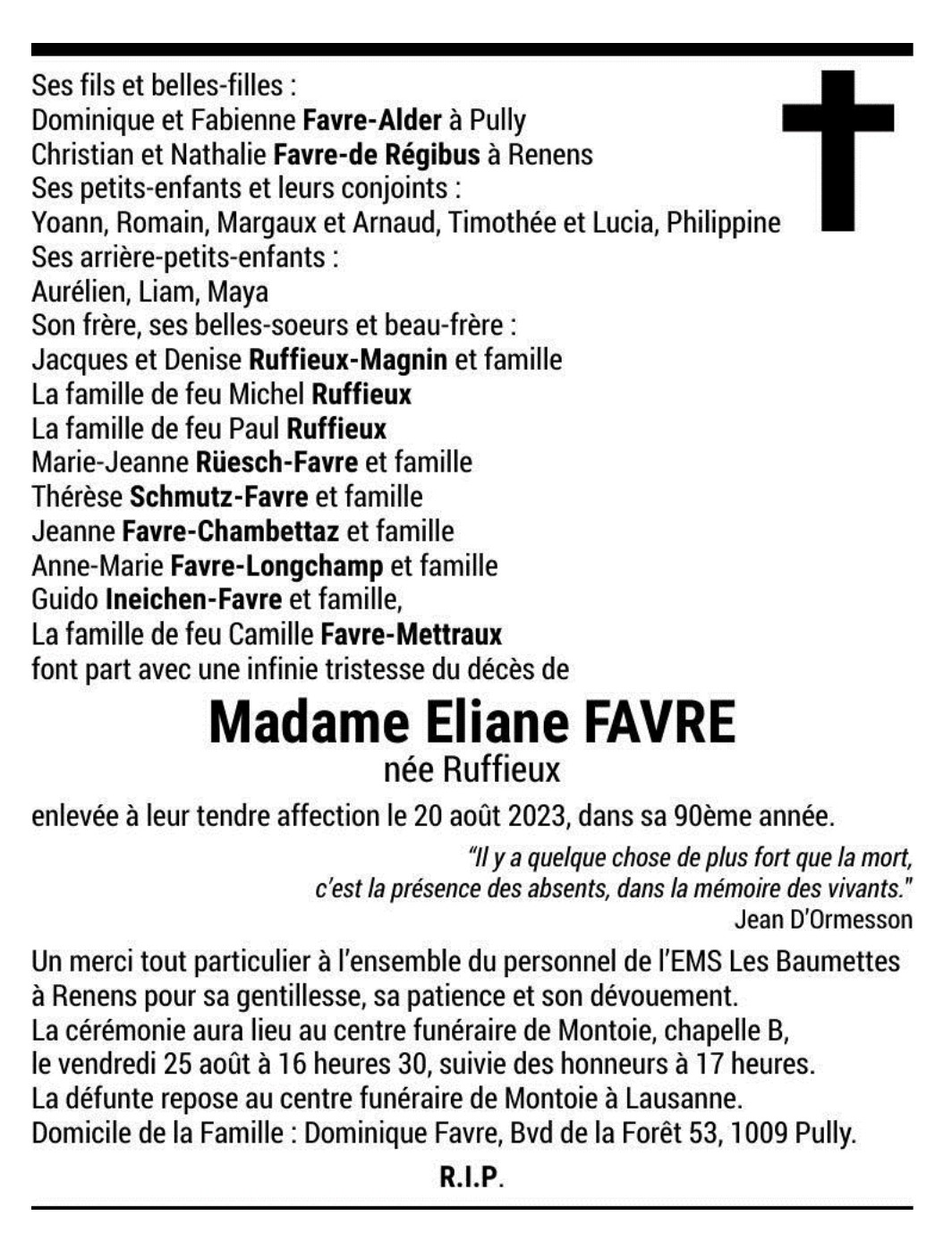 Madame Eliane FAVRE née Ruffieux 23 nov. 1933 - 20 aoû. 2023 Avis mortuaire PFG Télecharger PDF Partager sur: Galerie PreviousNext PreviousNext
