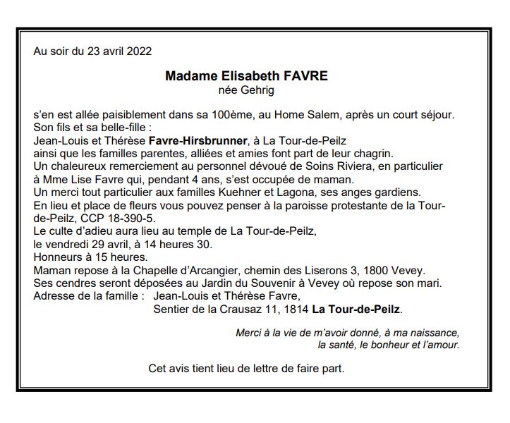 Madame Elisabeth FAVRE 23 mar. 1923 - 23 avr. 2022 Avis mortuaire PFG Télecharger PDF Partager sur: Galerie PreviousNext PreviousNext