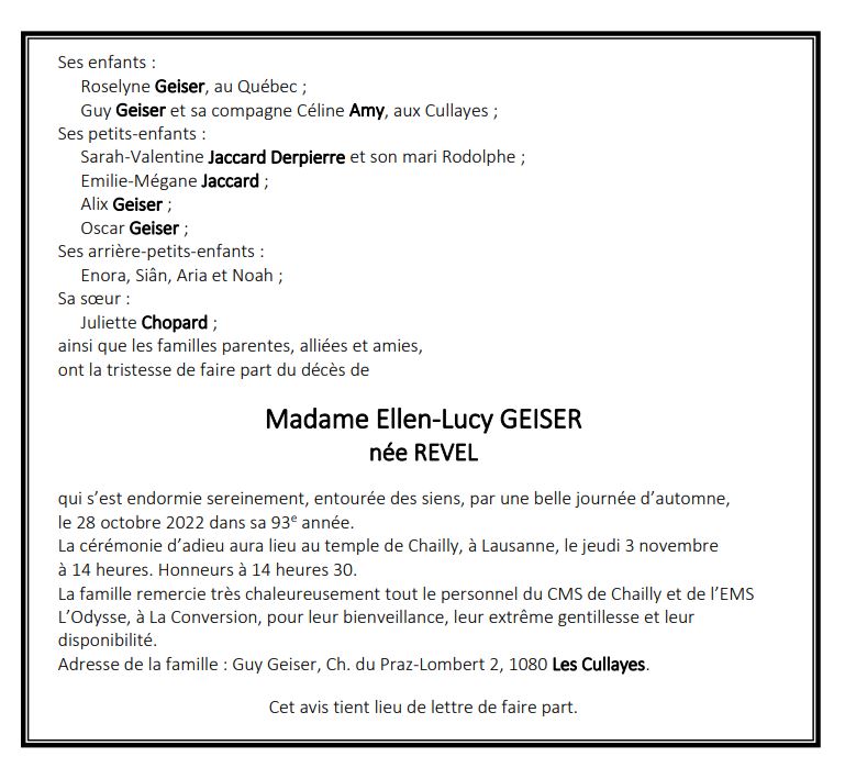 Madame Ellen-Lucy GEISER 24 nov. 1929 - 28 oct. 2022 Avis mortuaire PFG Télecharger PDF Partager sur: Galerie PreviousNext PreviousNext