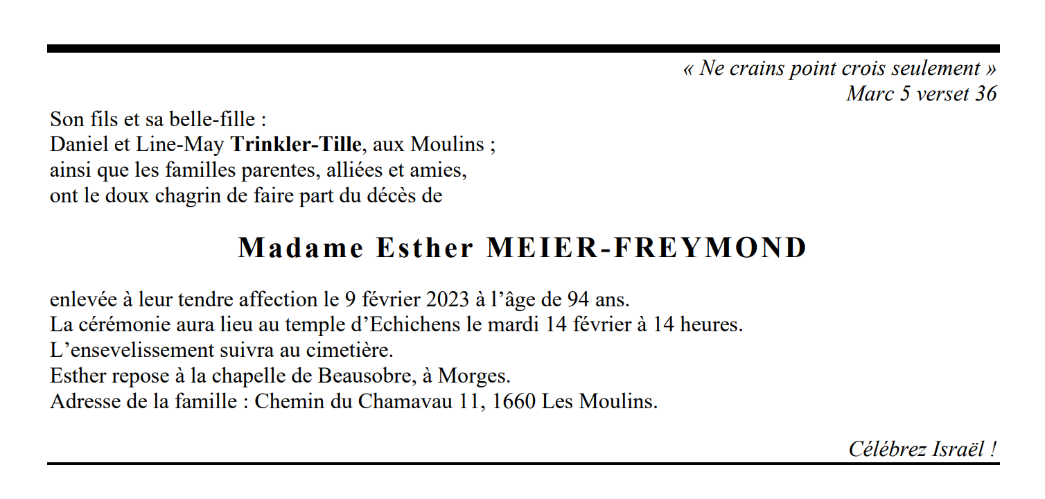 Madame Esther MEIER-FREYMOND 21 jan. 1929 - 09 fév. 2023 Avis mortuaire PFG Télecharger PDF Partager sur: Galerie PreviousNext PreviousNext