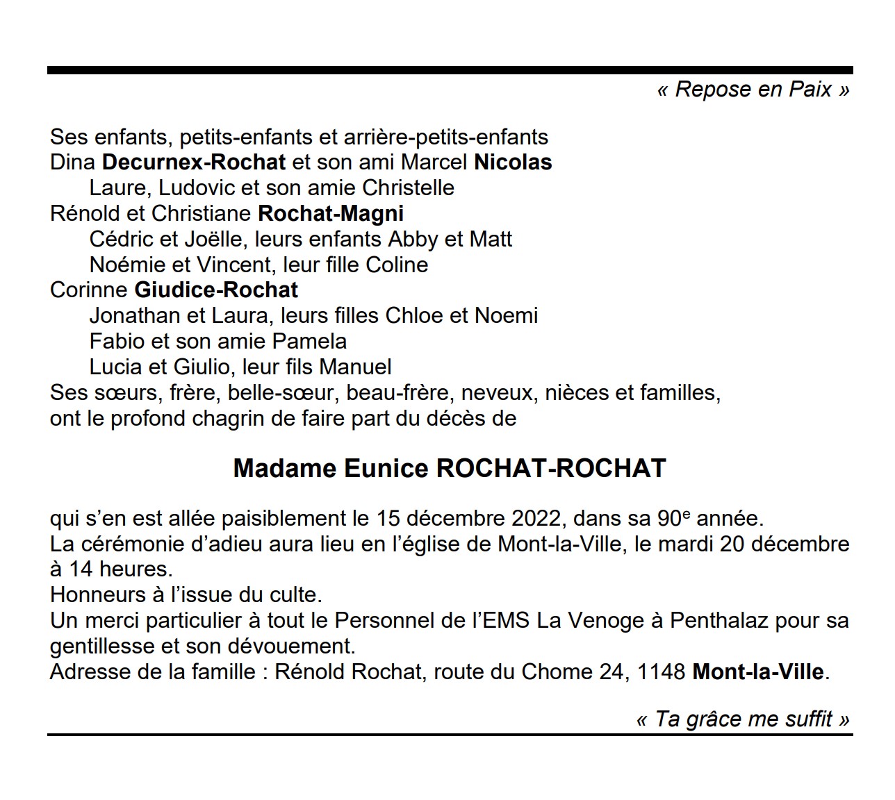 Madame Eunice ROCHAT-ROCHAT 18 sep. 1933 - 15 déc. 2022 Avis mortuaire PFG Télecharger PDF Partager sur: Galerie PreviousNext PreviousNext