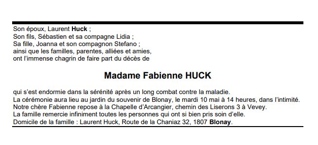 Madame Fabienne HUCK 29 jan. 1973 - 02 mai. 2022 Avis mortuaire PFG Télecharger PDF Partager sur: Galerie PreviousNext PreviousNext
