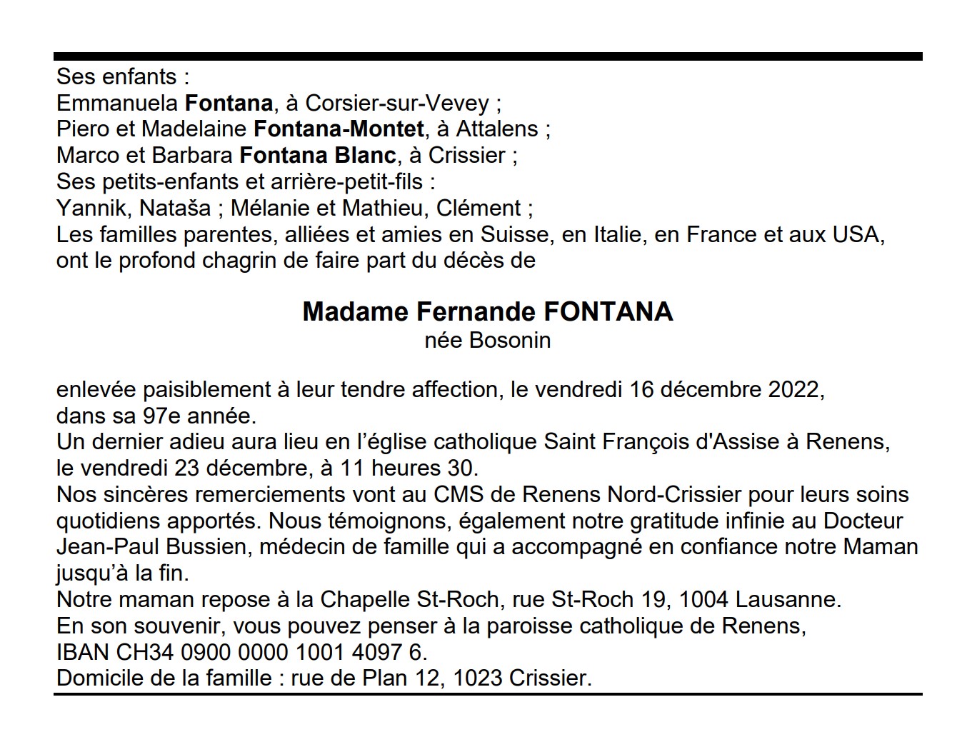 Madame Fernande FONTANA 20 juin. 1926 - 16 déc. 2022 Avis mortuaire PFG Télecharger PDF Partager sur: Galerie PreviousNext PreviousNext