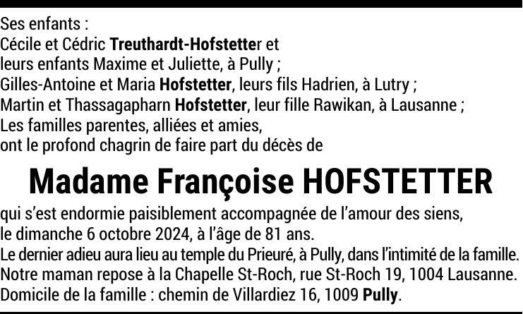 Madame Françoise HOFSTETTER 18 juil. 1943 - 06 oct. 2024 Avis mortuaire PFG Partager sur: Galerie PreviousNext PreviousNext